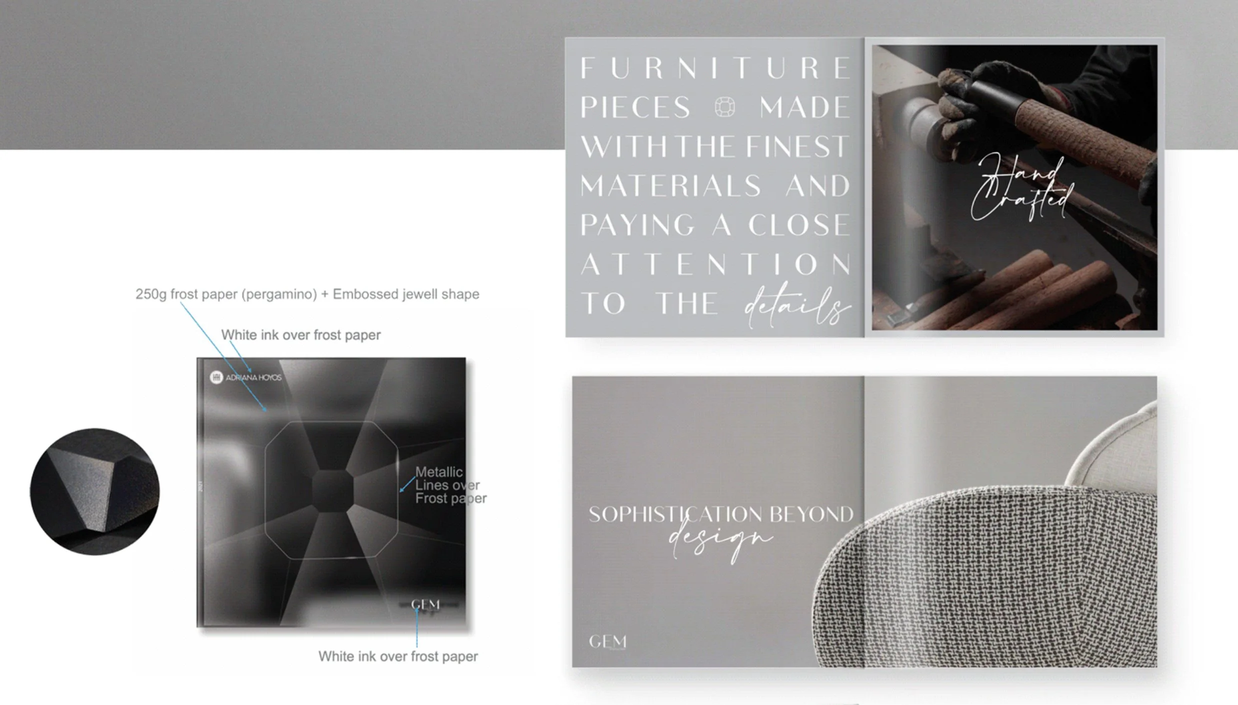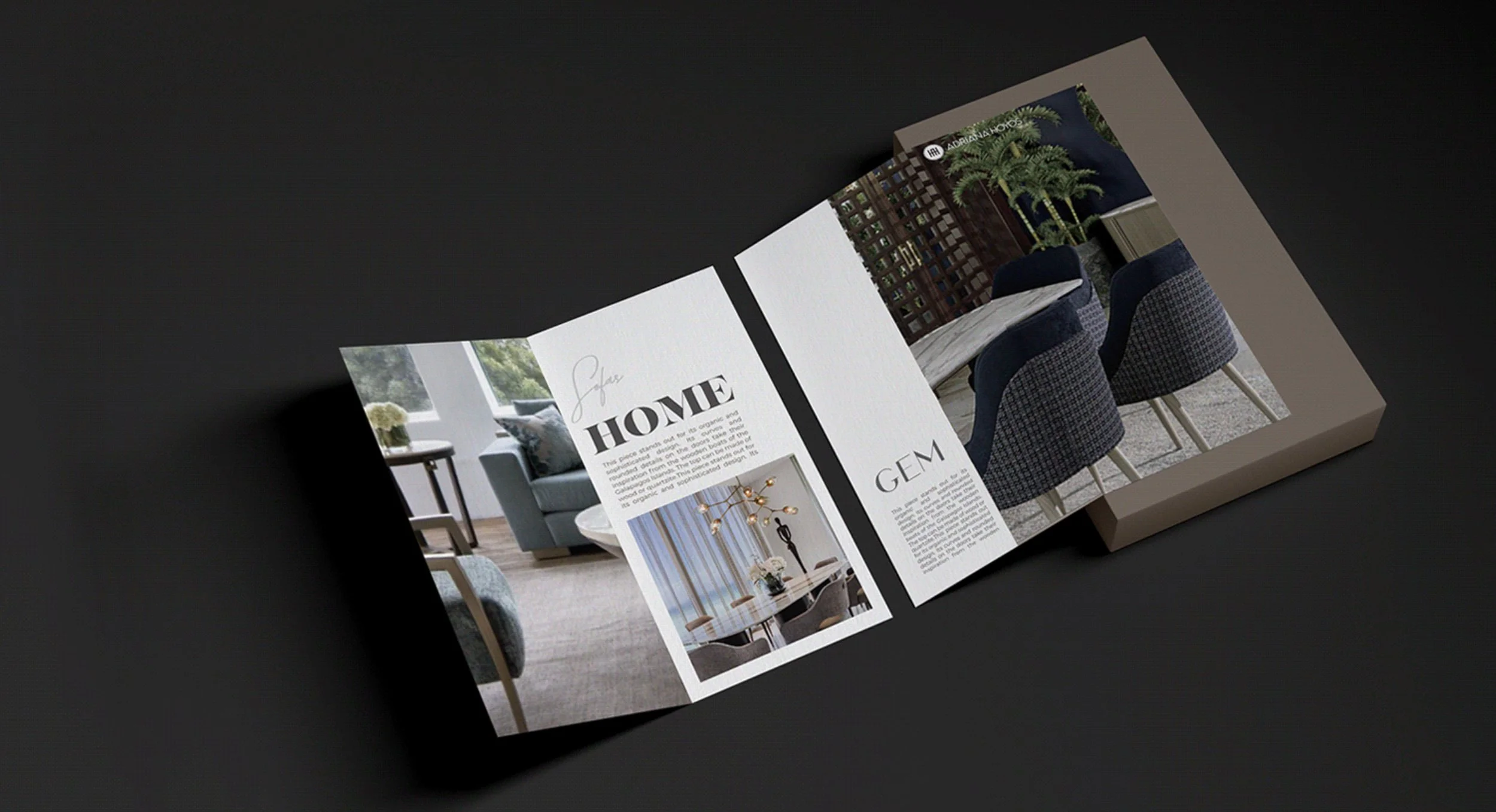 We got the challenge to design a complete visual system and asset for the International Launch of the GEM collection for Adriana Hoyos Ecuador. Inspired by the beauty of the Diamonds and Gems, the design language of each furniture piece is reflected in the details of our designs, bring the spirit of luxury and passion to every detail. We needed to create Brochures, fliers, postcards.